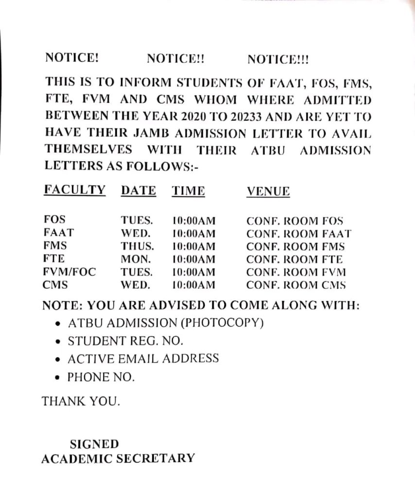 The Abubakar Tafawa Balewa University (ATBU) has announced that students from the Faculties of Agriculture and Agricultural Technology (FAAT), Science (FOS), Management Sciences (FMS), Technology Education (FTE), Veterinary Medicine (FVM), and College of Medical Sciences (CMS) who were admitted between 2020 and 2023 and are yet to receive their JAMB admission letters can now collect them.