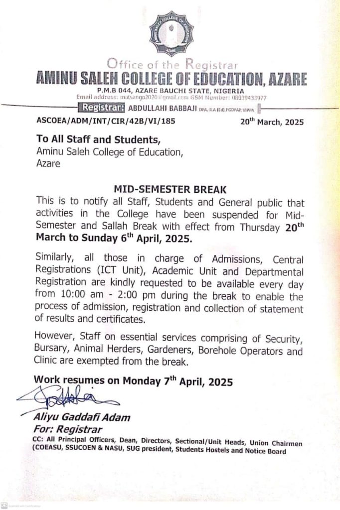 AMINU SALEH COLLEGE OF EDUCATION AZARE ANNOUNCES MID-SEMESTER BREAK