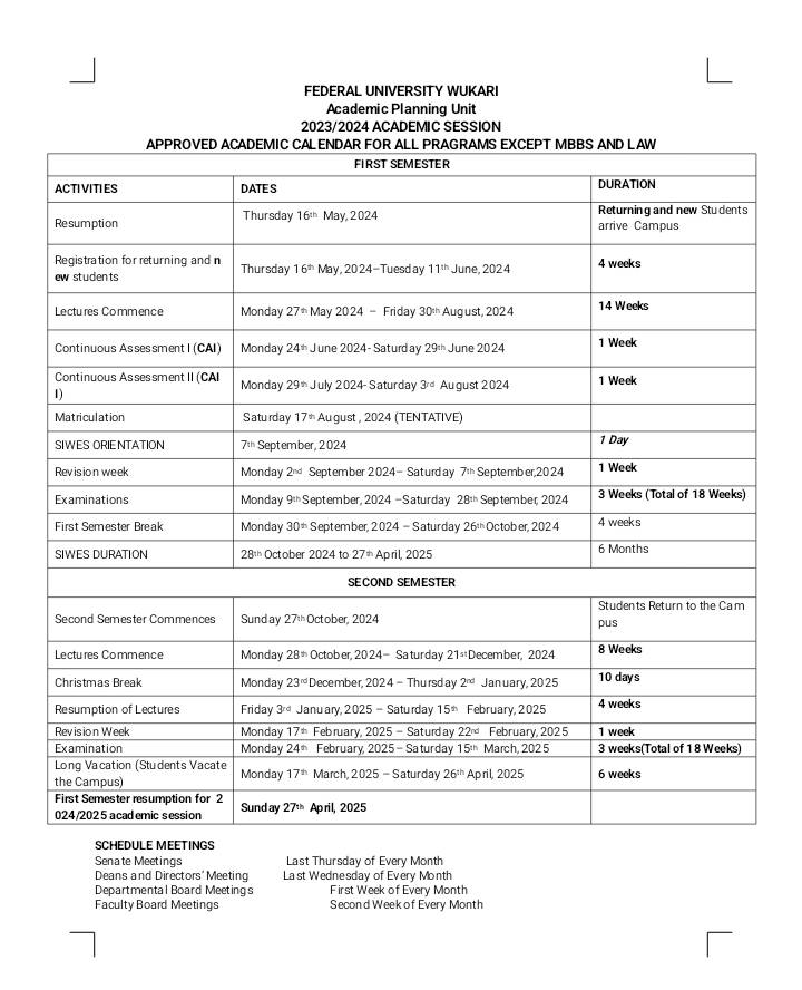 FEDERAL UNIVERSITY WUKARI (FUWUKARI) RELEASES APPROVED ACADEMIC CALENDAR FOR THE 2024/2025 ACADEMIC SESSION
